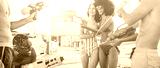 Happy friends doing battle with water guns - Young people laughing and having fun in vacation holiday - Youth, summer lifestyle and holiday concept - Focus on right women faces