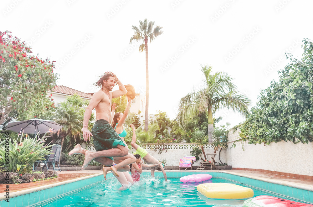 Group of happy friends drinking jumping in pool at sunset party - Young diverse culture people having fun in tropical vacation - Holiday, youth and friendship concept - Main focus on close-up man