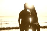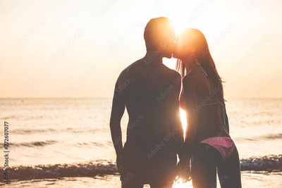 Young couple kissing at sunset with see and sunlight in background - Boyfriend and girlfriend having tender moments in summer vacation - Holiday, travel and love concept - Focus on bodies silhouette
