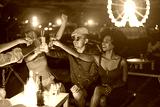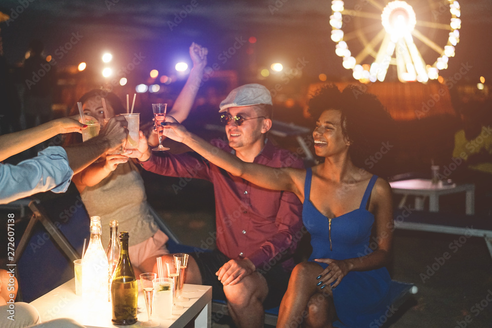 Happy friends cheering and drinking cocktails at beach party outdoor - Young millennials people having fun at weekend summer night - Youth lifestyle and nightlife concept - Main focus on glasses