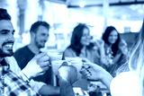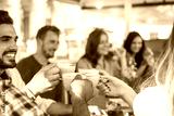 Happy friends drinking cappuccino at vintage bar cafe - Young trendy people enjoying breakfast - Friendship, youth lifestyle and meal break concept - Focus on bottom indian man hand