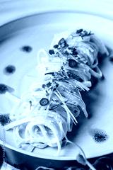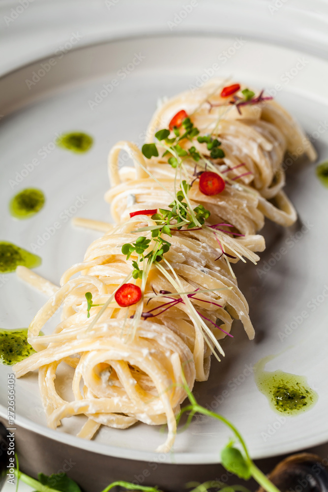 The concept of Italian cuisine. Pasta with cream sauce, pesto and seafood, mussels. European cuisine. Serving dishes in the restaurant with microgreen. copy space