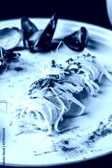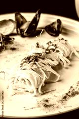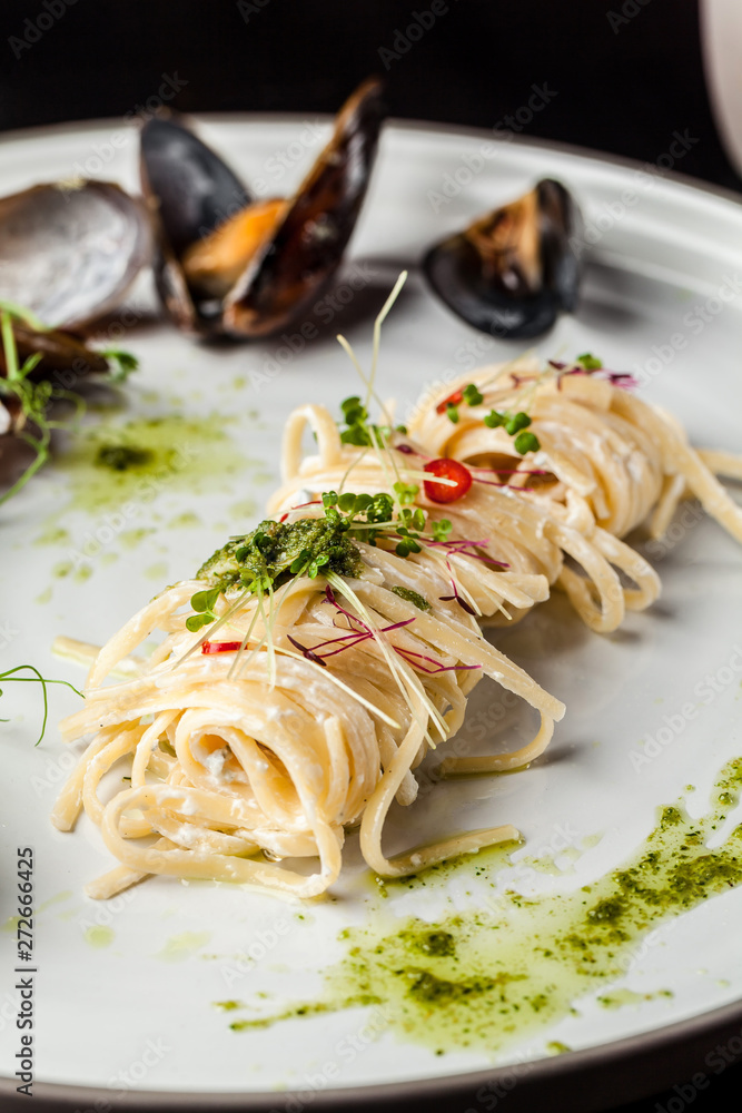 The concept of Italian cuisine. Pasta with cream sauce, pesto and seafood, mussels. European cuisine. Serving dishes in the restaurant with microgreen. copy space