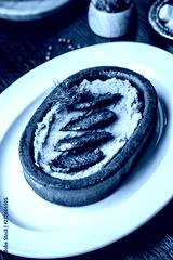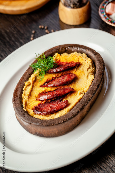 Traditional Turkish, Arabic cuisine. Hummus with salami sausage, in a clay plate, on a wood table. On a white plate. Serving dishes in the restaurant. copy space