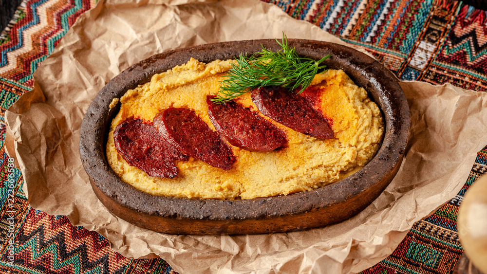 Traditional Turkish, Arabic cuisine. Hummus with salami sausage, in a clay plate, with parchment on a wood table. Serving dishes in the restaurant. copy space