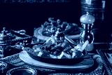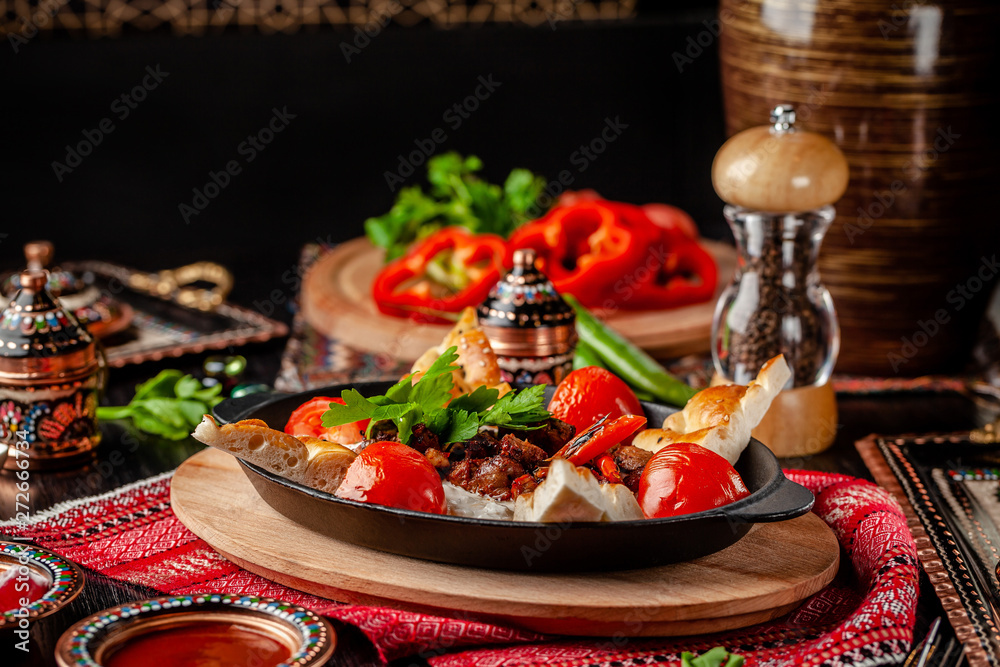 Traditional Turkish, Arabic cuisine. Ali Nazik Kebab. Chopped lamb with eggplant, yogurt and garlic. Ottoman food. Serving dishes in the restaurant. copy space