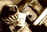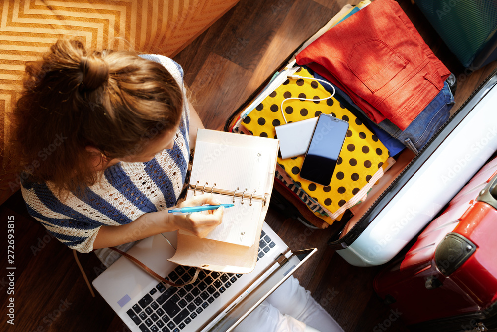 modern woman at modern home in sunny summer day planning trip