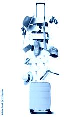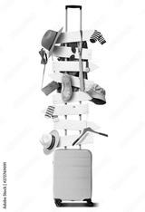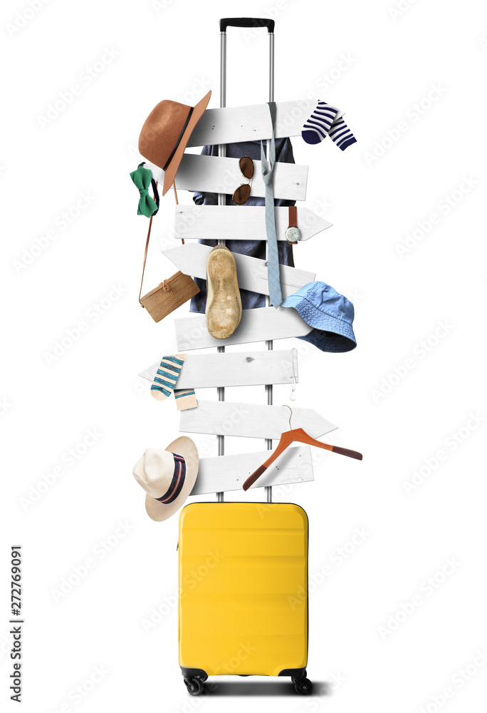 Travel suitcase with wooden signs and hanging clothes and accessories