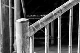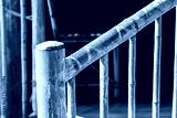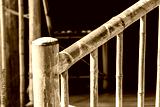 wooden handrail of bamboo summer house lit by sunlight close up.