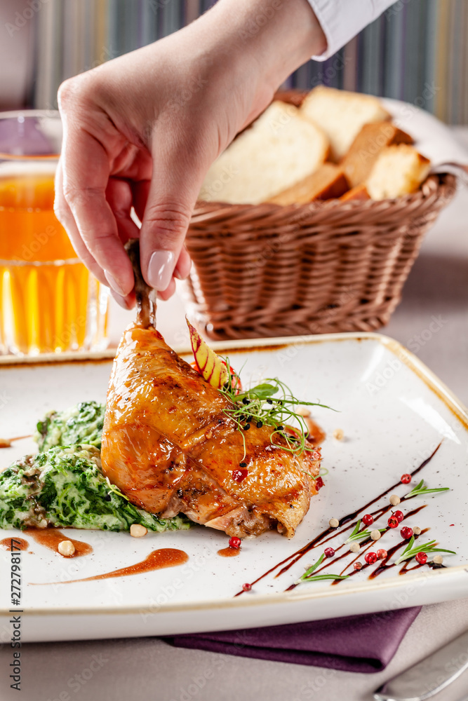 The concept of dinner in a Japanese restaurant. Spinach garnish with cream and glazed chicken legs in a spicy sauce. Plum wine in a glass. Background image. copy space