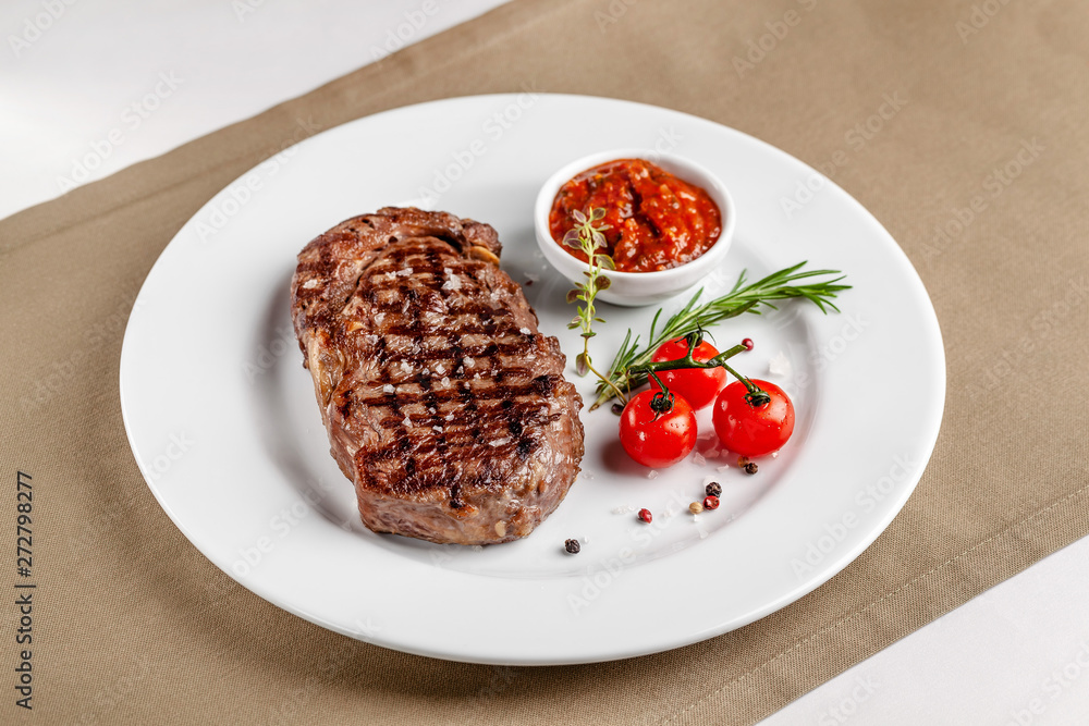 American cuisine. Beef steak with red bbq tomato sauce and cherry tomatoes. A glass of cool wine. Serving dishes on a white plate in a restaurant. Background image. copy space