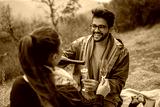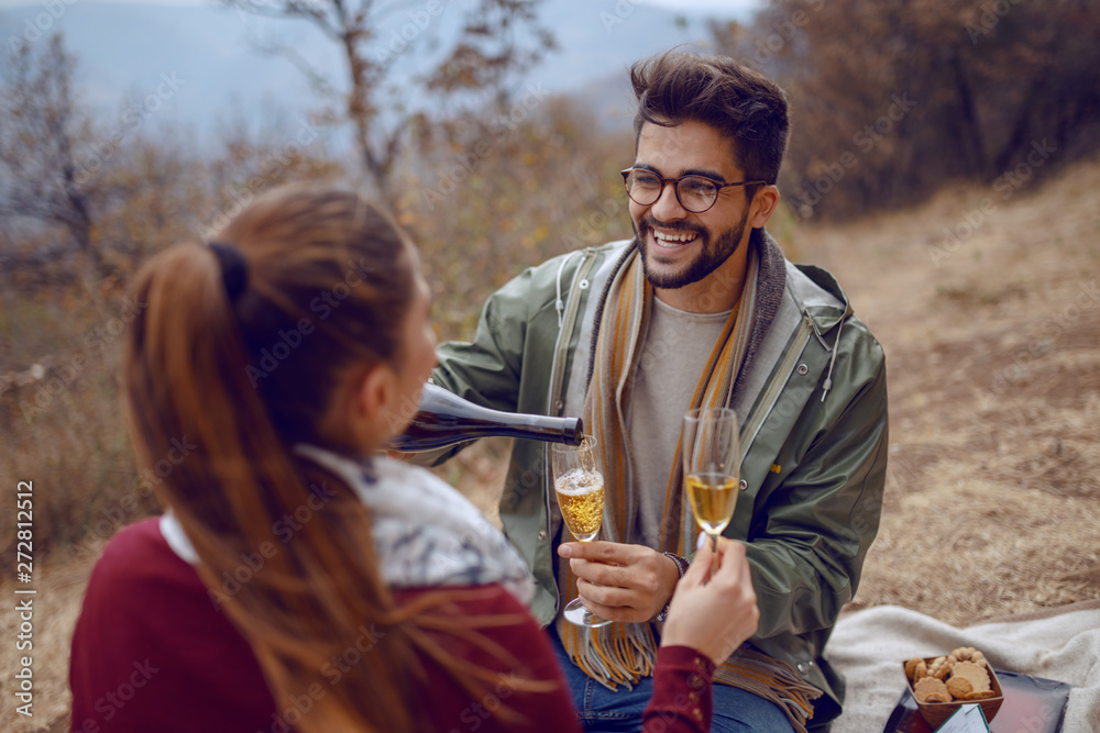 Cute couple multicultural couple in love enjoying picnic at autumn. Man pouring champagne in glasses.
