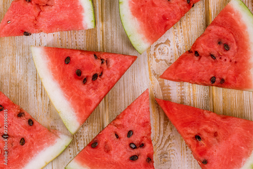 Pieces of watermelon on a wooden background