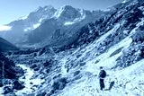 Back view of trekkers with beautiful landscape in Sagarmatha national park, Nepal.