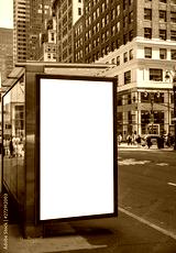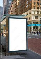 Blank billboard at bus stop for advertising, New York city buildings and street background