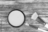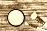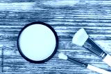 powder to equalize the tone of the face and two brushes lie on a burnt wooden background