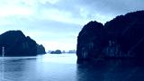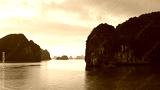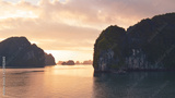 Halong bay at golden sunrise in Vietnam, South Asia. Panoramic view. Travel destination and natural background