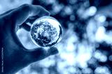 Reflection of blue sky, white clouds and trees in a glass ball in holding hand