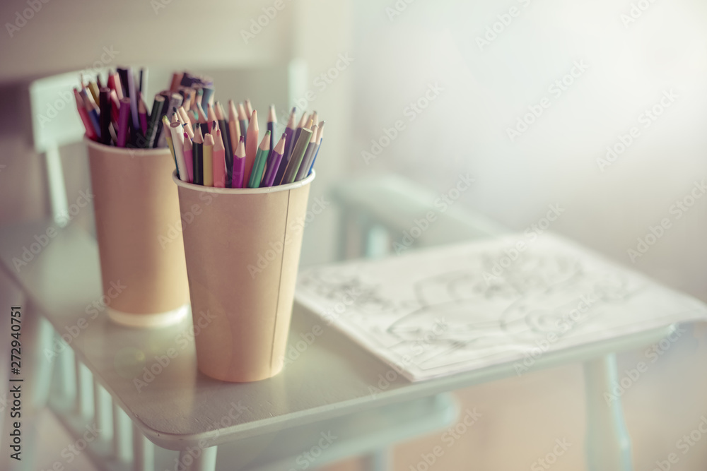 colored pencils are on the high chair. Warm and cozy place for drawing and creativity kids. close-up, warm colors.