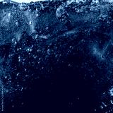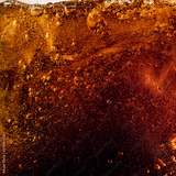 Close up view of the ice cubes in dark cola background. Texture of cooling sweet summer's drink with foam and macro bubbles on the glass wall. Fizzing or floating up to top of surface.