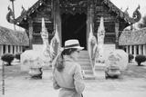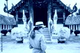 Back view of young Asian woman traveling in Chiang Mai province, Thailand with beautiful architecture of Wat Inthrawat temple at the background.