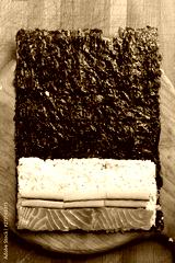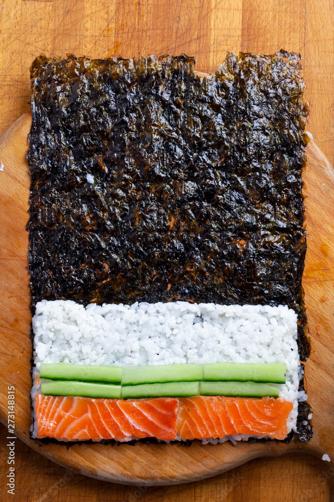 Vibrant Fresh Handmade Tuna and Salmon sushi on Natural Wood chopping board