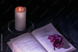 an open book with a candle. on the pages is a Bud of dried rose. romantic mood, poetry and love. close-up, dark background.