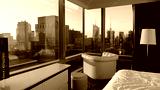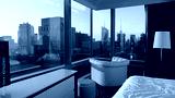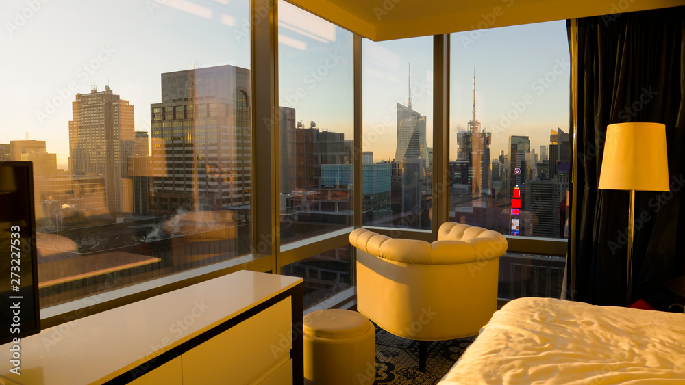 CLOSE UP: Spectacular view of downtown New York at sunrise from a hotel room.