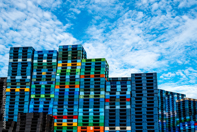 Plastic shipping pallet for sale and for rent business. Industry plastic pallet stacked at factory warehouse. Cargo and shipping business concept. Pile of plastic pallet for distribution and delivery.