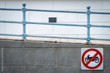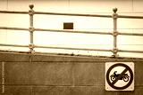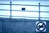 Motorcycle no entry sign install in front of tunnel under the road. Traffic sign to prohibit motorcycle. Restrictive signs. Ramp and iron rail. Motorcycle caution and stop driving to this way.