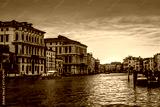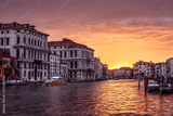 Venice at sunset, Italy. Panorama of Grand Canal in evening. Urban landscape of Venice in sun light. Beautiful sunny view of the Venice city at dusk. Romantic water trip across Venice in twilight.