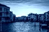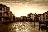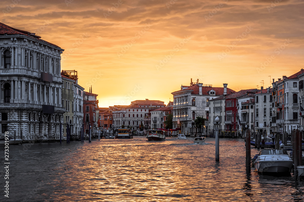Venice at sunset, Italy. Panorama of Grand Canal in evening. Urban landscape of Venice in sun light. Beautiful sunny view of the Venice city at dusk. Romantic water trip across Venice in twilight.