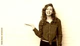 Redhead woman over white brick wall holding copyspace imaginary on the palm to insert an ad