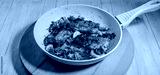 Bacon fried with onions and herbs in a pan of light color on a cutting Board and light background
