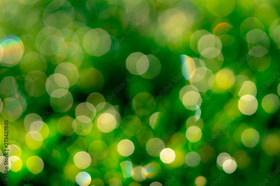 Blurred fresh green grass field in the early morning. Green grass with bokeh background in spring. Nature background. Clean environment. Green bokeh abstract background with sun light.