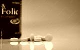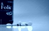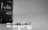 Round pink tablets pill on gradient background. Vitamins and minerals plus folic acid vitamin E and zinc in drug bottle on gradient background. Pink tablets pills for during and after pregnancy woman.