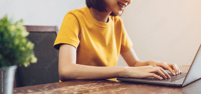 Smiling of Asian woman's hands typing on laptop computer and searching web, browsing in the workplace at office.