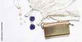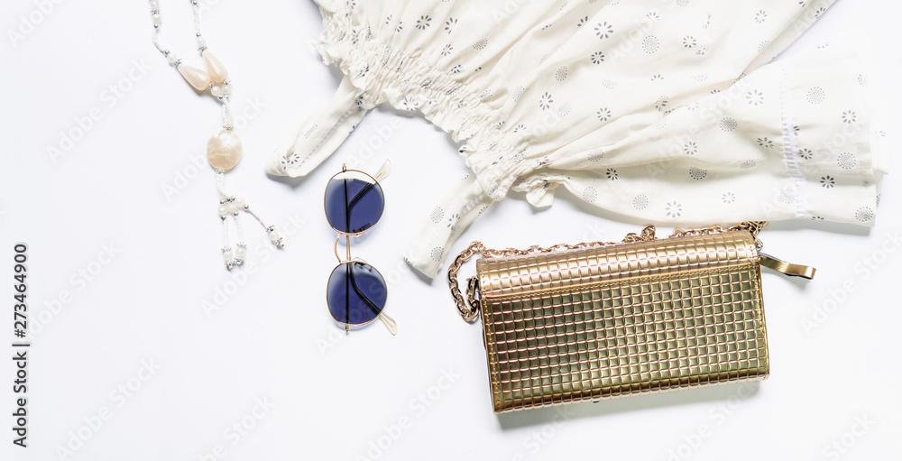 flat lay of woman clothes and accessories set with glasses, handbag. Trendy fashion female background.