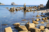 Beautiful landscape of a blue evening sea, horizon and rocks