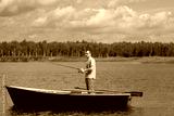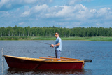 a man in yellow glasses, on a boat with oars, holding a fishing rod and fishing in the middle of the lake, against a beautiful landscape