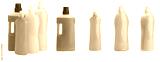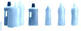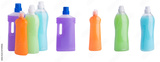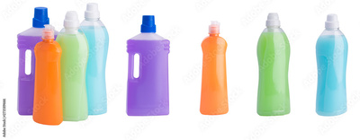 detergents and cleaning products in bottles of different shapes and colors isolated on white