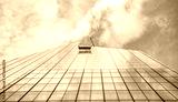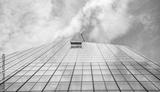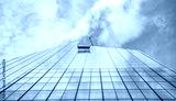New York, Manhattan. Glass cleaning services, high building glass facade, view from below against blue sky background