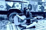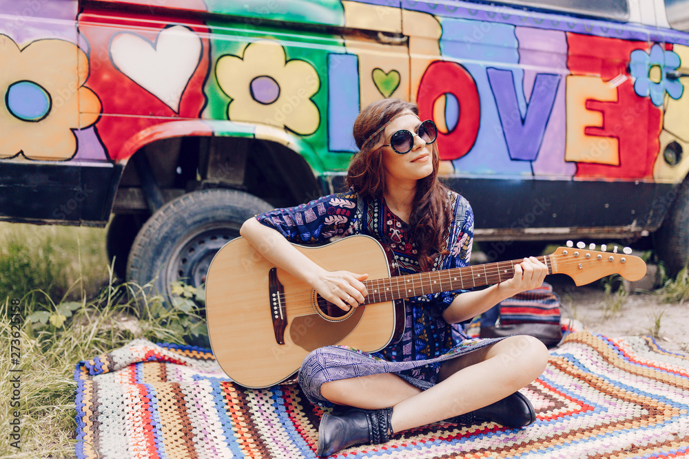 full of joyful feeling satisfaction for beautiful blonde young woman playing alone the acoustic guitar with the wind on his hair in summer time vacation leisure. pretty lady lifestyle.
