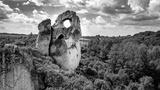 A panoramic view of the unique Okiennik rock in Poland with a large natural window