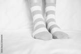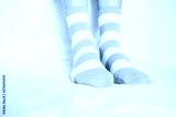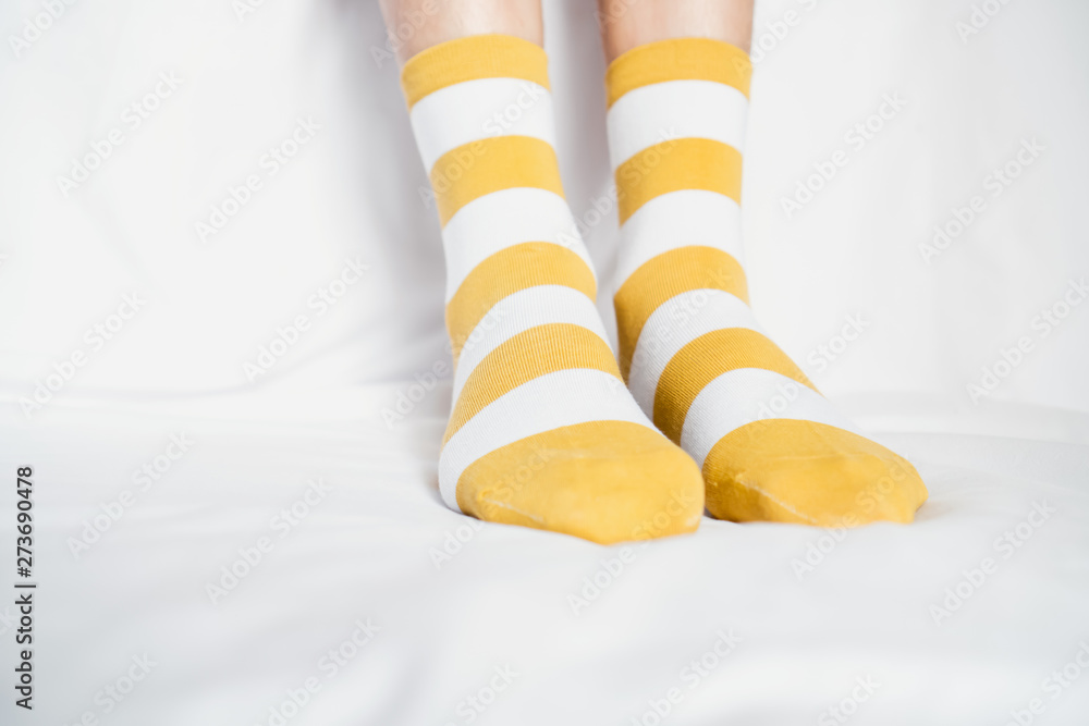 Women's legs in socks colors alternating, side stand on white fabric floor.