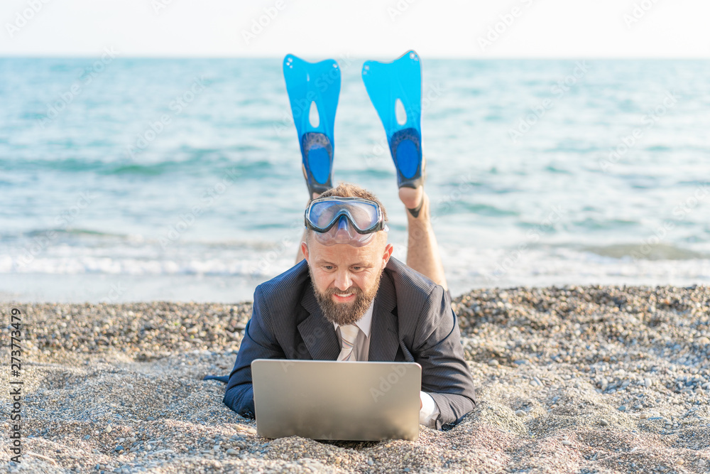 Successful businessman wearing snorkeling tools is working on the beach with laptop