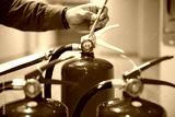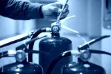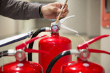 Red Fire extinguishers in the building,Engineers are checking fire extinguishers.