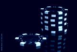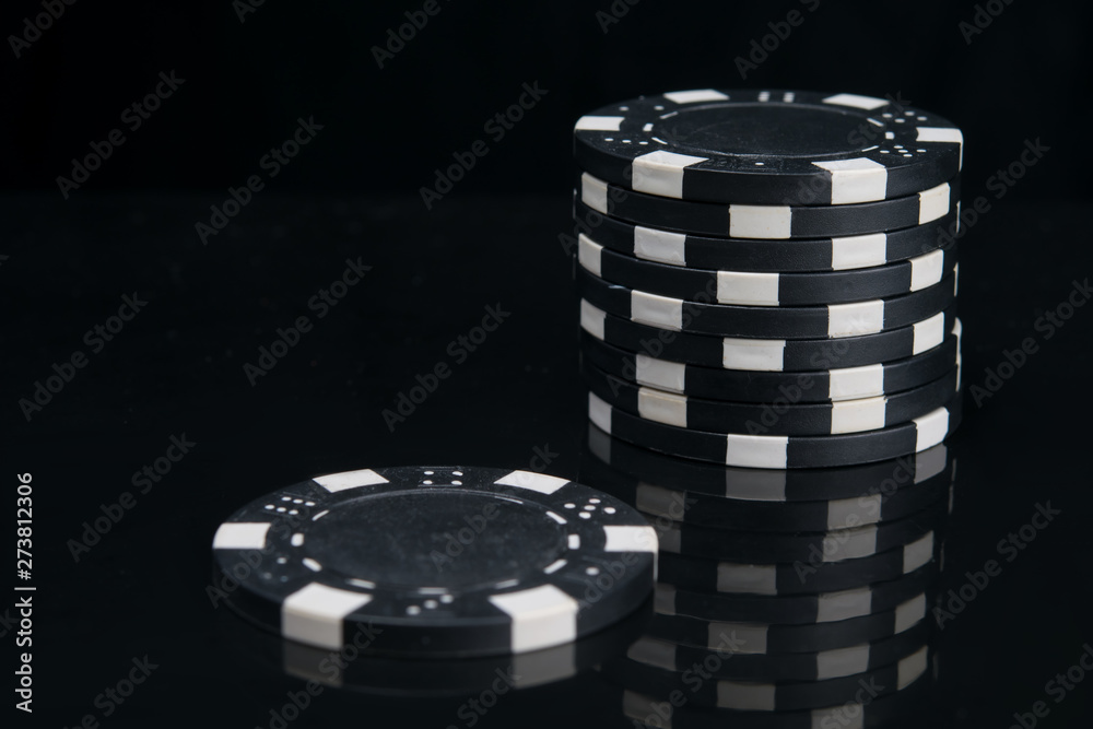 on a black background with reflection, close-up of blackjack chips