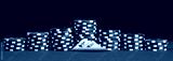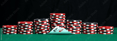 on a green table, for playing poker, pyramids of chips of different colors and two raised cards, aces, on top of a black background for the inscription