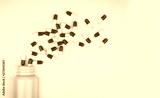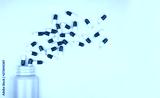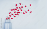 Red-white antibiotic capsule pills spread out of white plastic drug bottle. Antibiotic drug resistance concept. Antibiotic drug use. Global healthcare. Pharmacy background. Pharmaceutical industry.
